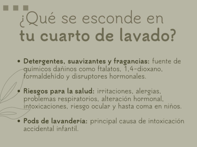 What's hiding in your laundry room? • Detergents, fabric softeners, and fragrances: source of harmful chemicals such as phthalates, 1,4-dioxane, formaldehyde, and hormone disruptors. Health risks: irritation, allergies, respiratory problems, hormonal disruption, poisoning, eye risks, and even coma in children. • Laundry pods: leading cause of accidental poisoning in children.